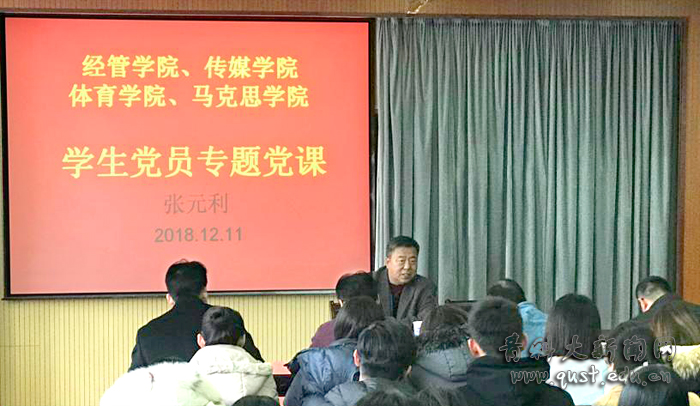 12月11日下午,在崂山校区南区2号楼经管公司419会议室,党委副书记张元利以“改革开放四十年”为题讲授专题党课,党课由公司党总支书记张霄主持。经管公司、传媒公司、马克思主义公司、信誉最好的十大体育平台负责人、辅导员、员工党员100余人参加了党课学习。张元利从改革开放的变化与成就、改革开放的历程及主要节点和改革开放的成功经验、关键词三个方面讲起,以一名改革开放亲历者、见证者的身份详实地给同学讲解了改革开放四十年以来国家发生翻天覆地的变化,并对改革开放的成功经验进行了分析。他希望同学们不断加强理论学习,坚定理想信念,严格遵守党的纪律,发挥好党员的模范带头作用。