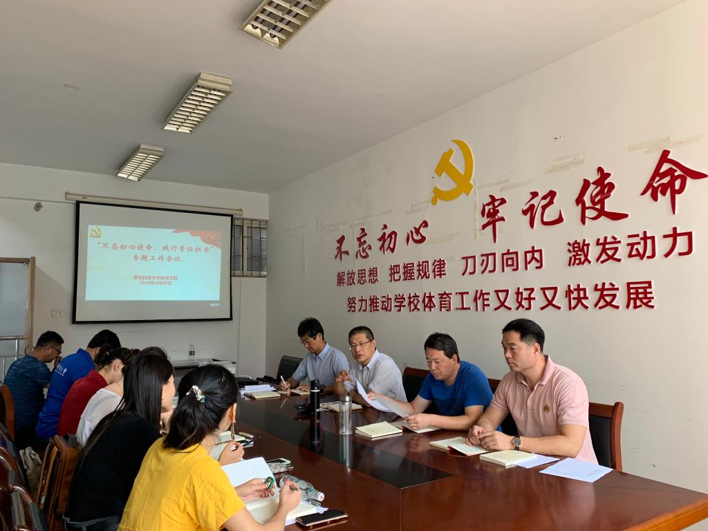 此次专题工作会议是结合近期山东省高等公司体育工作评价的有关内容,召开公司第一次“不忘初心、牢记使命”主题教育集体学习,葛振营要求全体参会党员同志要将本次学习的工作精神融到具体工作中去,以钉钉子的精神对照迎评赋分要点查漏补缺。本次迎评工作是本学期公司、公司体育工作的重点任务,校领导高度重视,大家要有良好的工作态度,对待工作不能存在松懈、懒散的情况,要有集体意识和群策群力意识,发挥党员的模范作用,不断推动公司体育工作再创新辉煌。楚晓东在发言中指出,本次活动希望大家做好头,牢记一名共产党员的初心、责任与担当,认真对待公共体育课程教学工作,在上课时要以身作则,不能出现早退、迟到、不负责的情况,近期要加强考勤和员工管理,对出现的问题要及时上报并尽快解决,对师生提出的意见和建议要认真吸取并修改,真正将责任意识做到位,落到实。